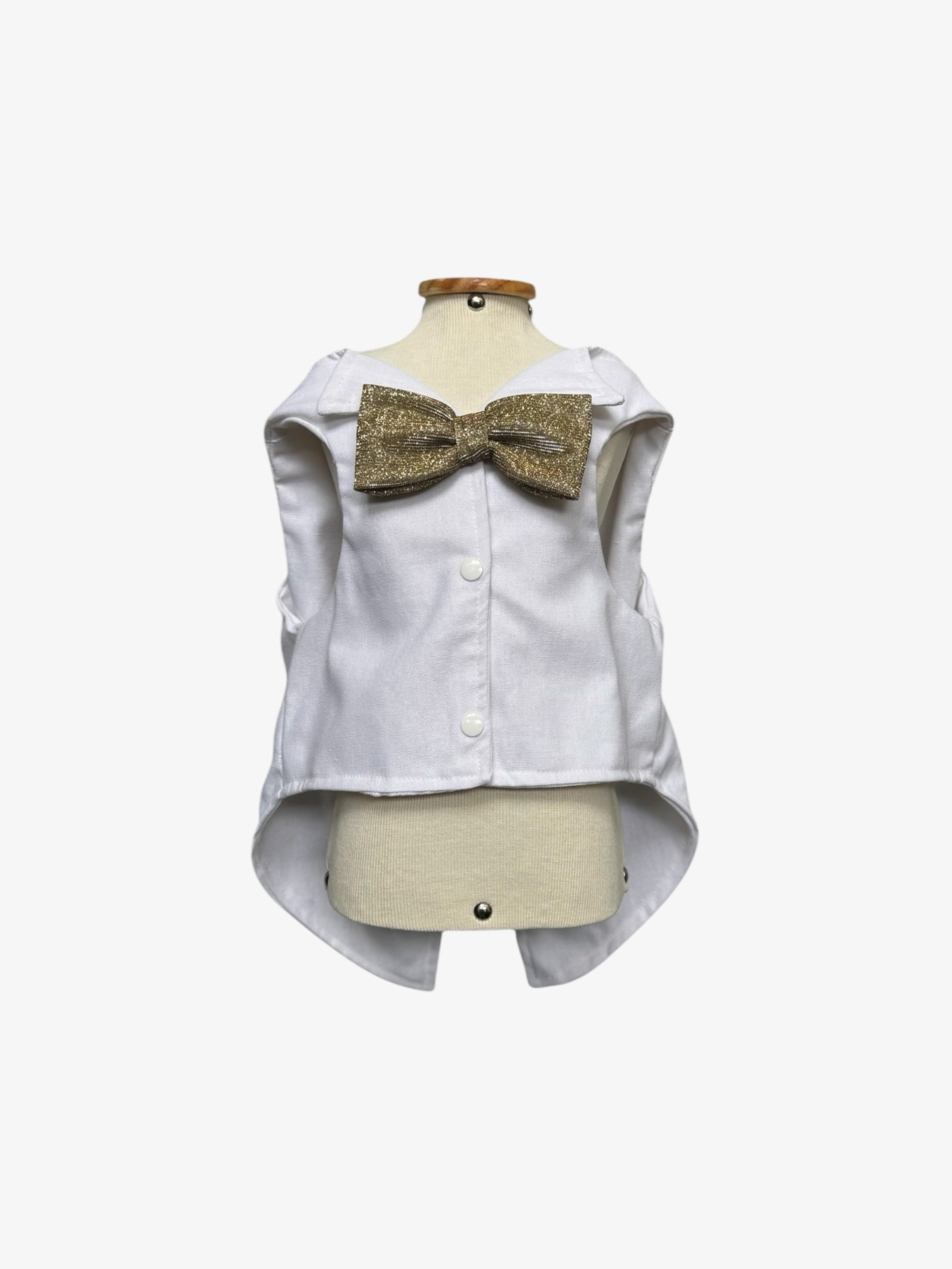 O Colete Réveillon é sinônimo de elegância e charme para o seu pet. Confeccionado em linho com algodão, ele traz uma gravata borboleta dourada com brilho na parte frontal e um design alongado na parte traseira, que garante sofisticação em todos os ângulos. Com fechamento por botões e um acabamento impecável, é a peça ideal para ocasiões especiais, como festas de Ano Novo e celebrações glamorosas.